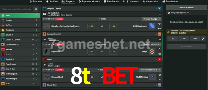 O 8t bet oferece uma grande seleção de opções de apostas em e-sports com probabilidades competitivas